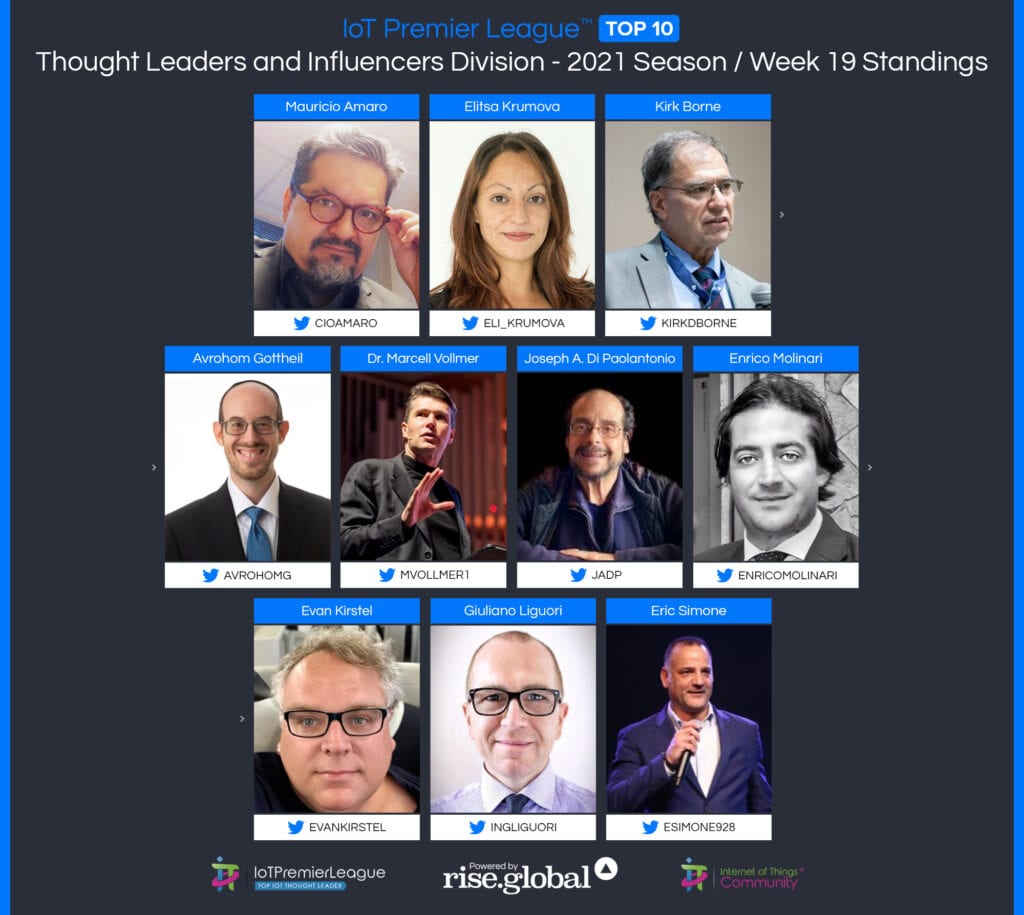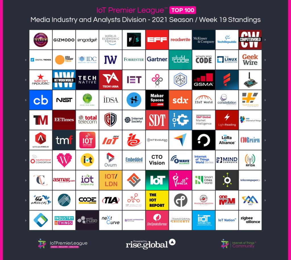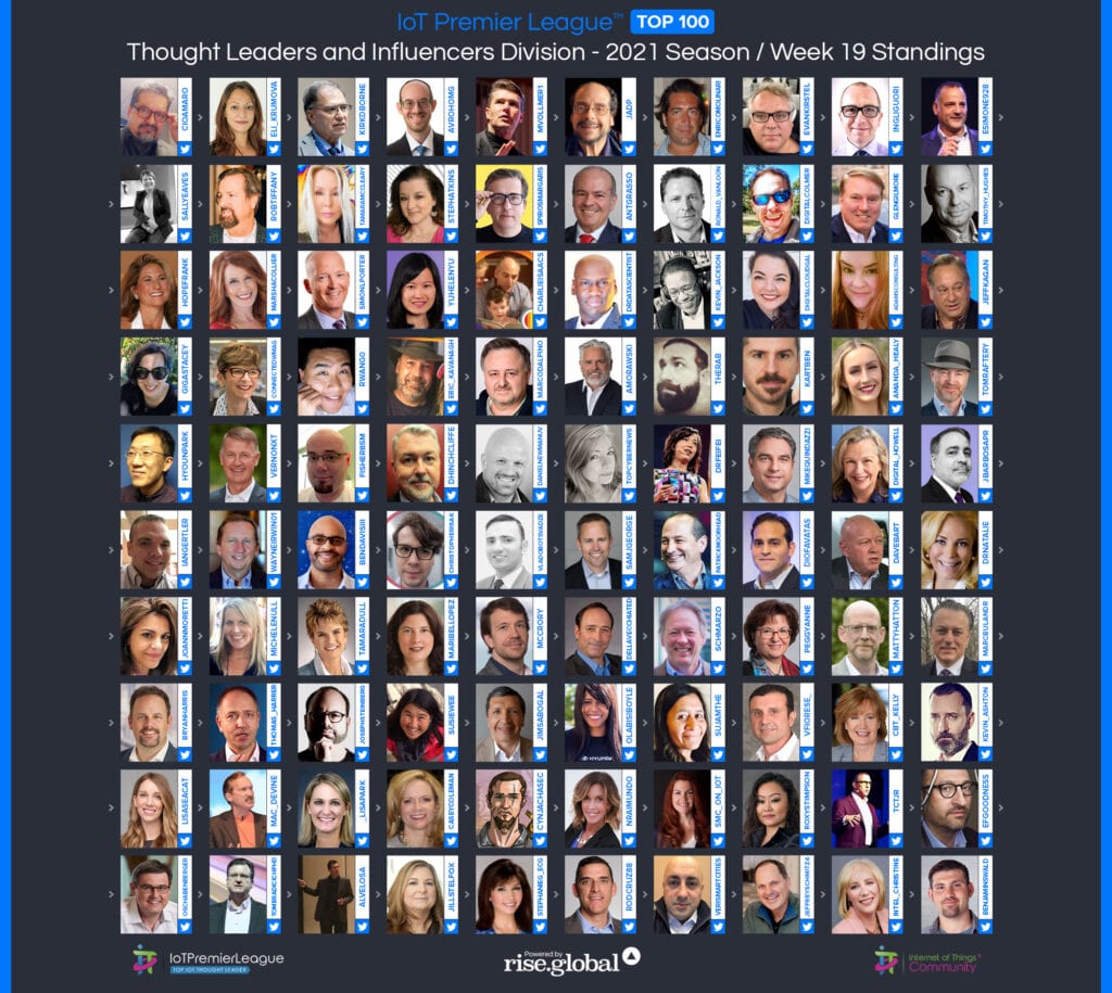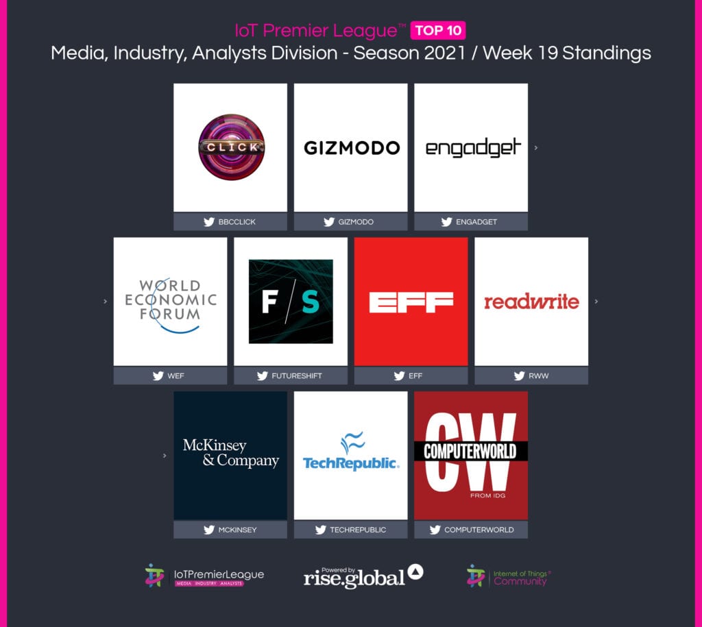 Since 2019, The IoT Premier League™ has been tracking the most inspiring social media accounts of the IoT landscape. This cuts across individual thought leaders, corporate handles and media, industry / analysts; recognising the most so you can follow them, join the community and learn more from the movers and shakers of the Internet of Things.