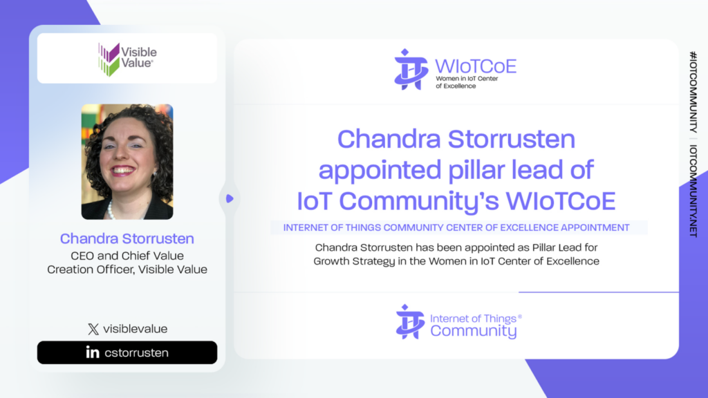 The IoT Community is excited to announce Chandra Storrusten, CEO and Chief Value Creation Officer, Visible Value, is appointed to the WIoTCoE as a Pillar Leader for Growth Strategy. Chandra is a dynamic thought-leader dedicated to transforming companies and their leadership. She specializes in crafting sustainable value creation strategies that enable organizations to seize pivotal opportunities during growth, transition, and transformation. Chandra inspires her clients to be mission, values, and purpose-driven organizations that attain long-term resiliency. Her thoughtful and strategic guidance helps clients enhance their position as innovative industry leaders who consistently realize their vision and outperform their competition. Beyond her client work, Chandra’s passion for transformation is evident in her industry and community contributions. She serves on numerous Boards and has been an Advisor to the Transformative Leadership in Disruptive Times program at George Washington University School of Business. Chandra earned an Executive MBA from Duke University’s Fuqua School of Business, where she also served on the Alumni Council. Currently, she is actively involved in leading local alumni events. In addition, Chandra serves on the Board of Advisors for NC TECH. Her dedication extends to personal interests as well; she enjoys traveling, cooking, and spending quality time with her husband and family. Through every endeavor, Chandra remains focused on fostering authentic alignment between personal growth and organizational success. Welcome to the IoT Community.