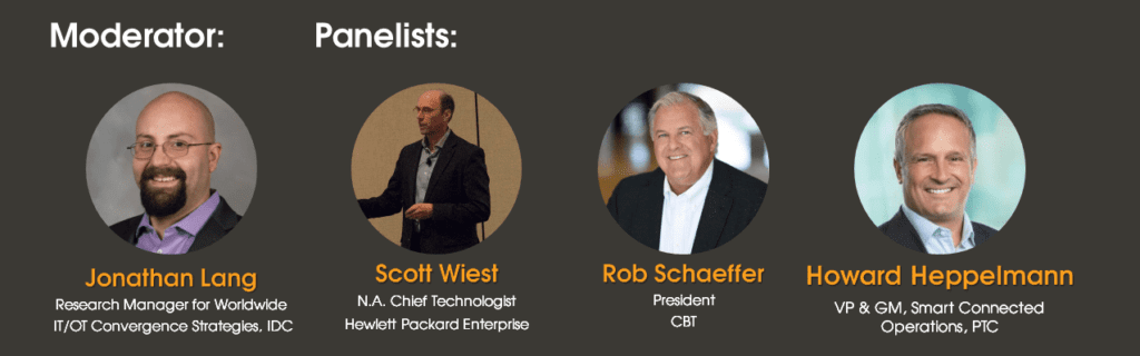 In this webinar, Jonathan Lang, Research Manager for Worldwide IT/OT Convergence Strategies at IDC, will address the emerging trends of Industry 4.0 for 2021 and beyond. Jonathan will be joined by an expert IT/OT panel comprised of Scott Wiest, North America Chief Technologist for Hewlett Packard Enterprise, Rob Schaeffer, President of CBT, and Howard Heppelmann, General Manager for IoT/SCO at PTC.