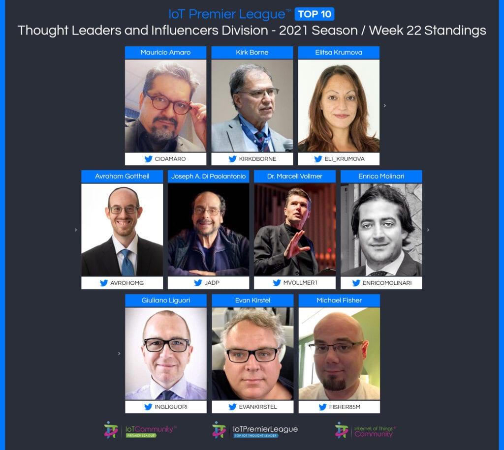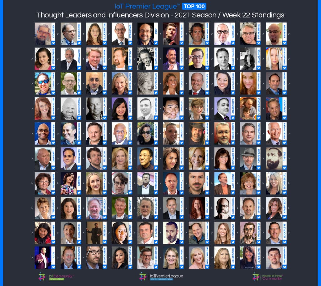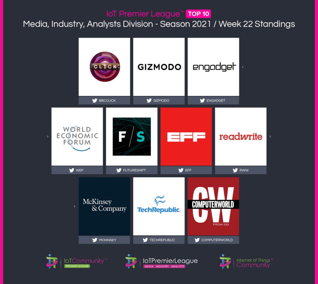 Since 2019, The IoT Premier League™ has been tracking the most inspiring social media accounts of the IoT landscape. This cuts across individual thought leaders, corporate handles and media, industry / analysts; recognising the most so you can follow them, join the community and learn more from the movers and shakers of the Internet of Things.