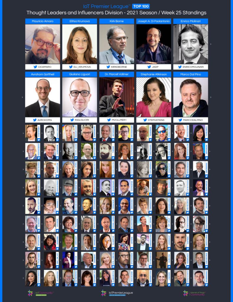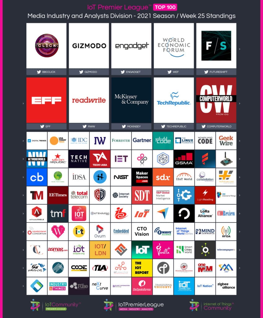 Since 2019, The IoT Premier League™ has been tracking the most inspiring social media accounts of the IoT landscape. This cuts across individual thought leaders, corporate handles and media, industry / analysts; recognising the most so you can follow them, join the community and learn more from the movers and shakers of the Internet of Things.