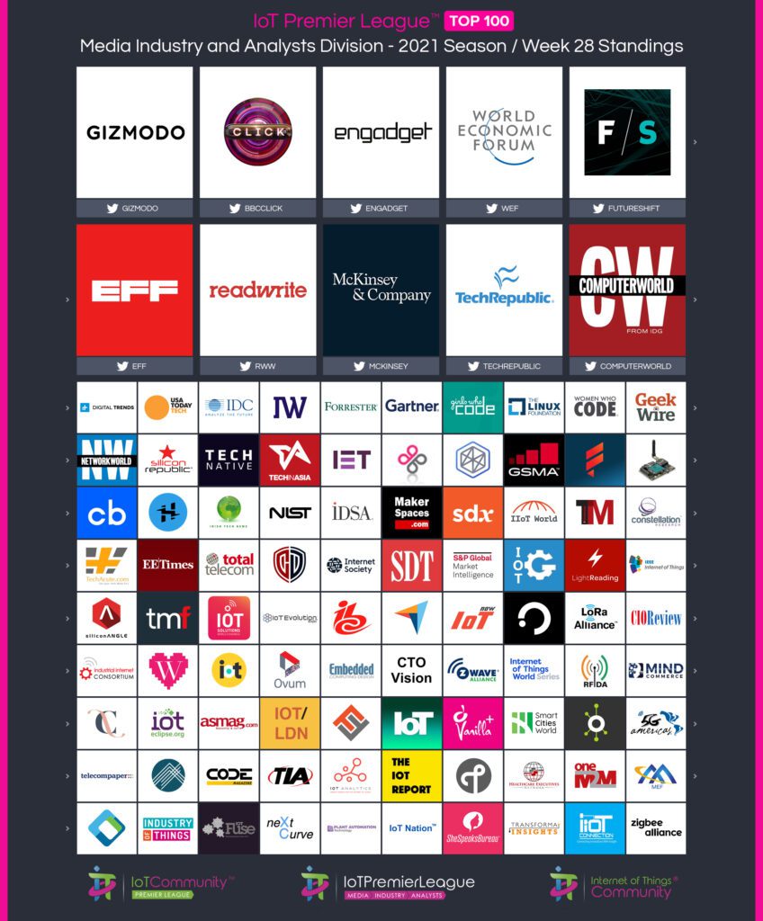 Since 2019, The IoT Premier League™ has been tracking the most inspiring social media accounts of the IoT landscape. This cuts across individual thought leaders, corporate handles and media, industry / analysts; recognising the most so you can follow them, join the community and learn more from the movers and shakers of the Internet of Things.