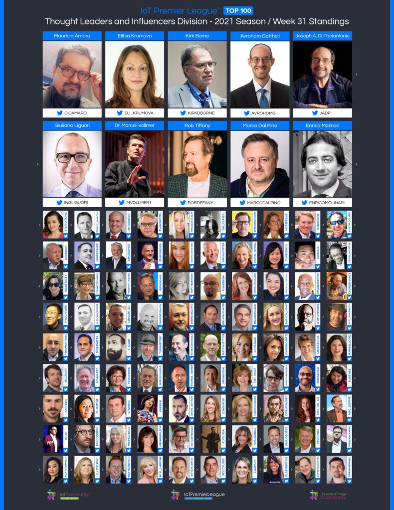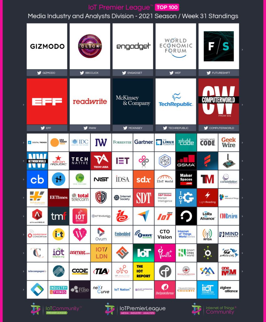 Since 2019, The IoT Premier League™ has been tracking the most inspiring social media accounts of the IoT landscape. This cuts across individual thought leaders, corporate handles and media, industry / analysts; recognising the most so you can follow them, join the community and learn more from the movers and shakers of the Internet of Things.