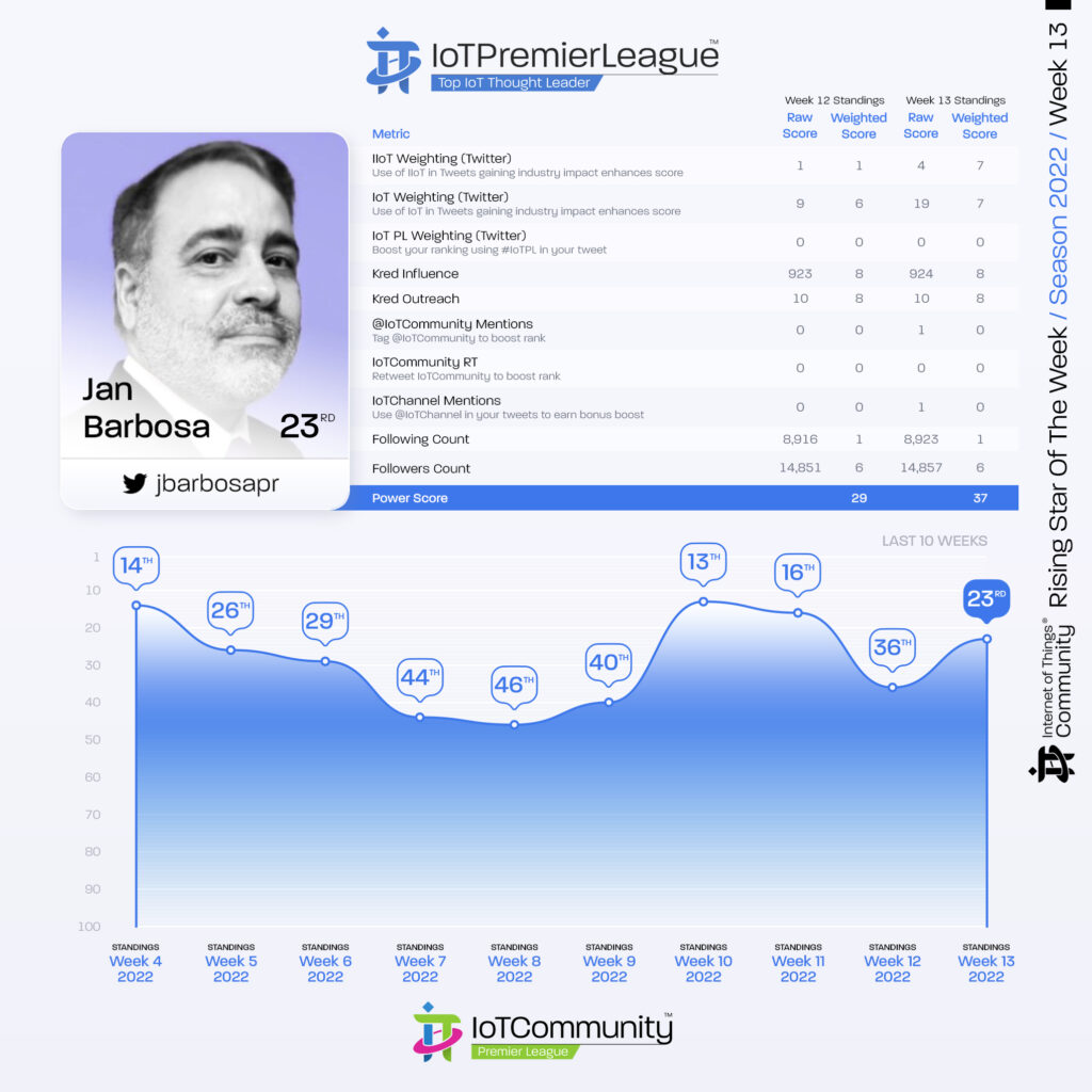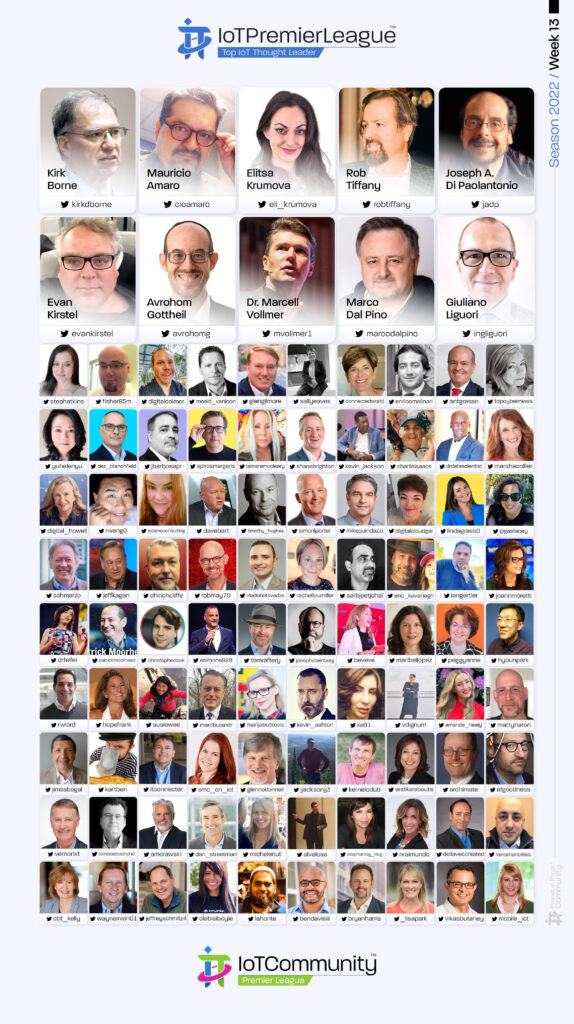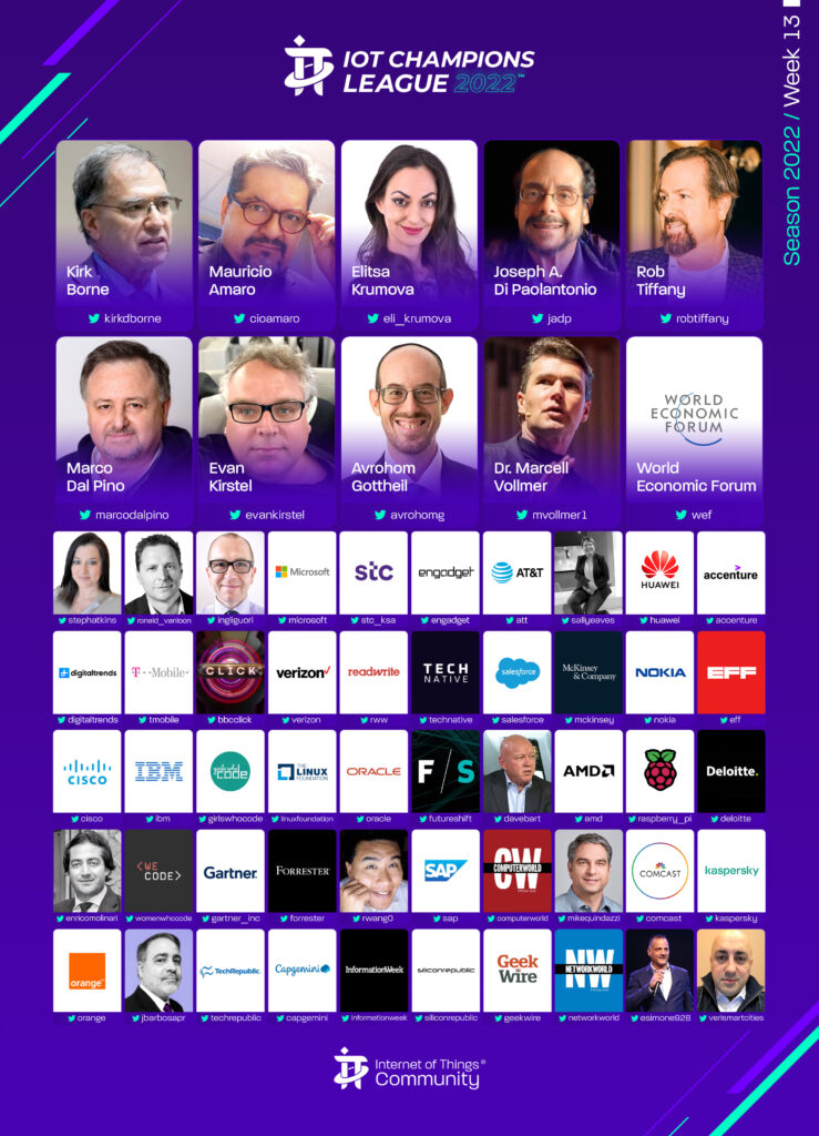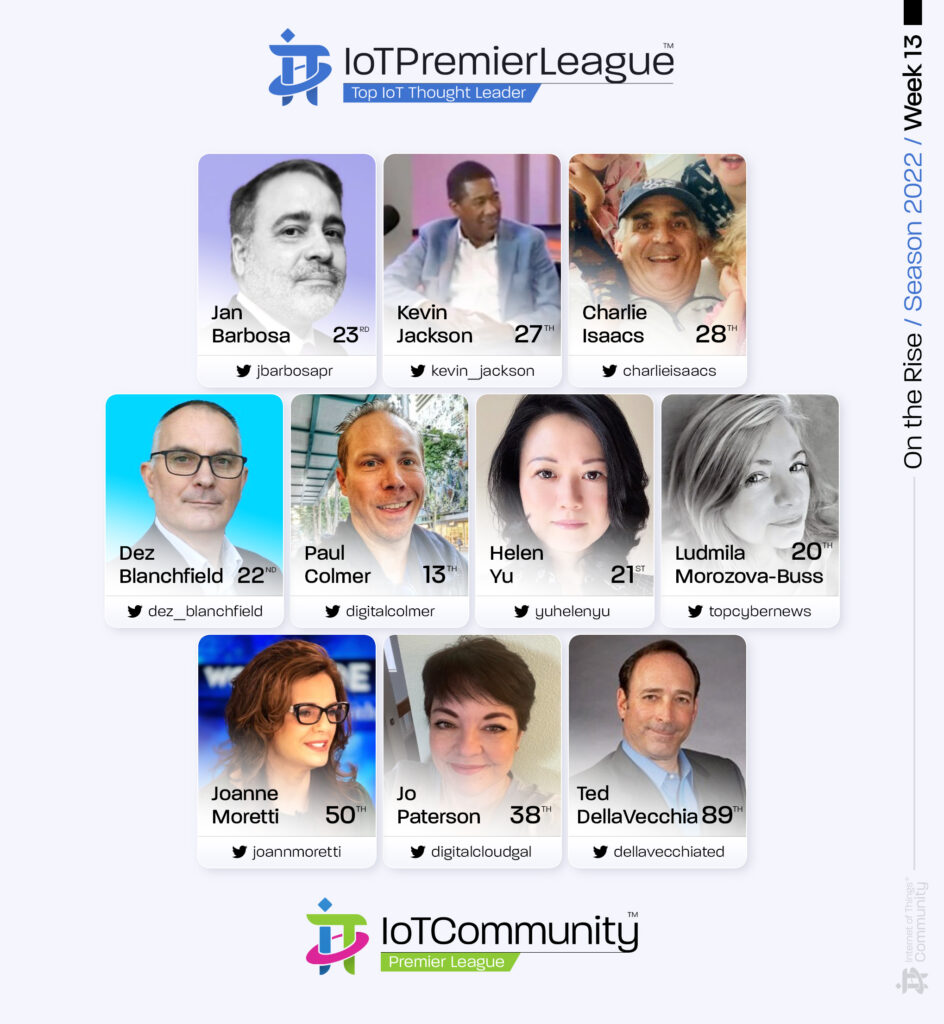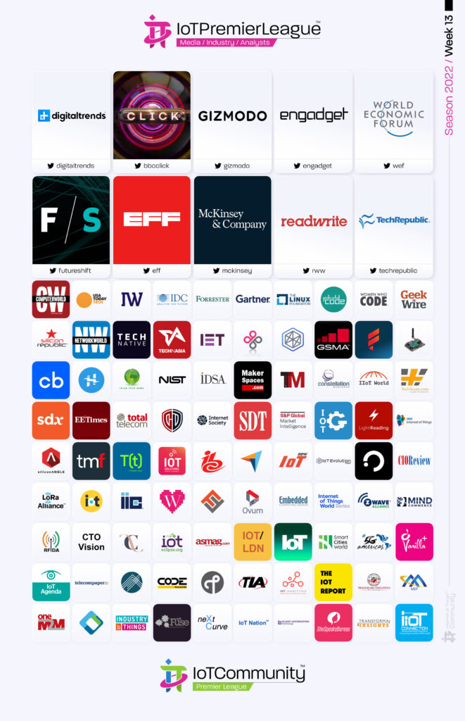 Since 2019, The IoT Premier League™ has been tracking the most inspiring social media accounts of the IoT landscape. This cuts across individual thought leaders, corporate handles and media, industry / analysts; recognising the most so you can follow them, join the community and learn more from the movers and shakers of the Internet of Things.