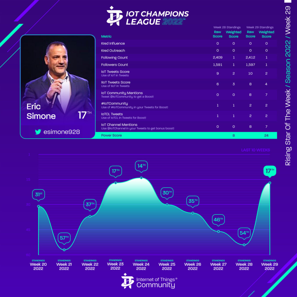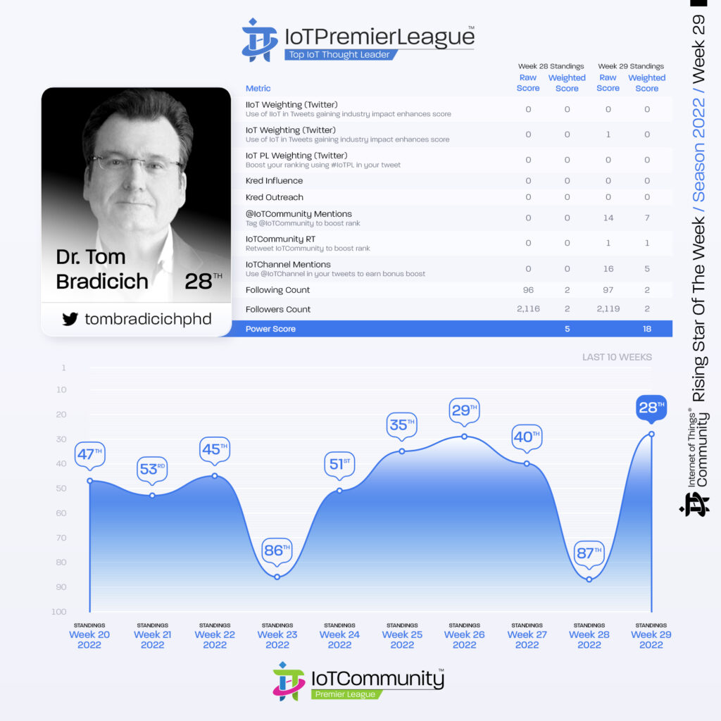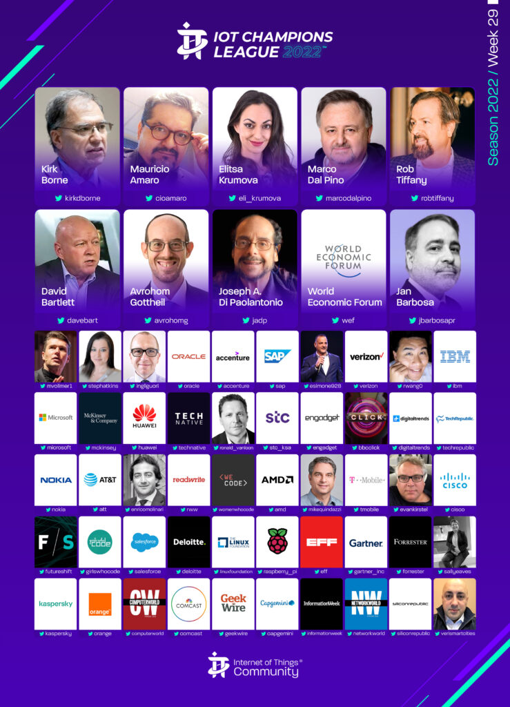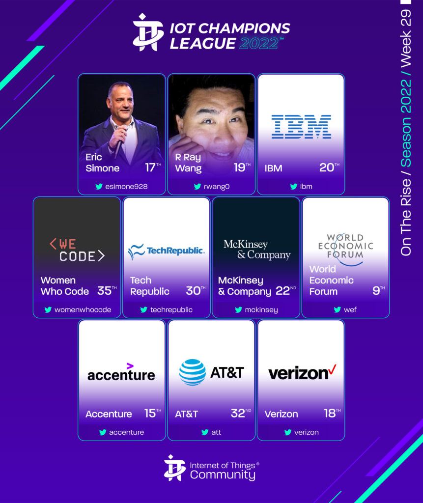 Since 2019, The IoT Premier League™ has been tracking the most inspiring social media accounts of the IoT landscape. This cuts across individual thought leaders, corporate handles and media, industry / analysts; recognising the most so you can follow them, join the community and learn more from the movers and shakers of the Internet of Things.