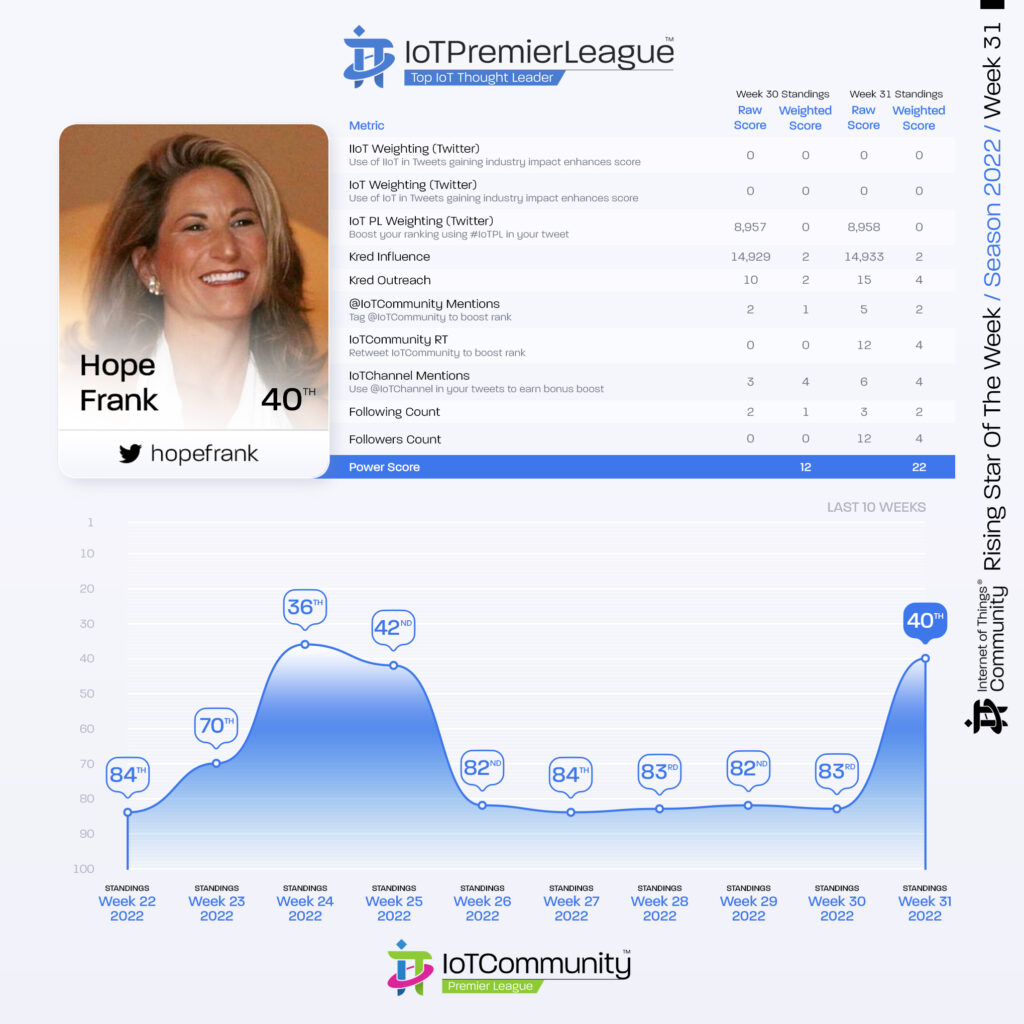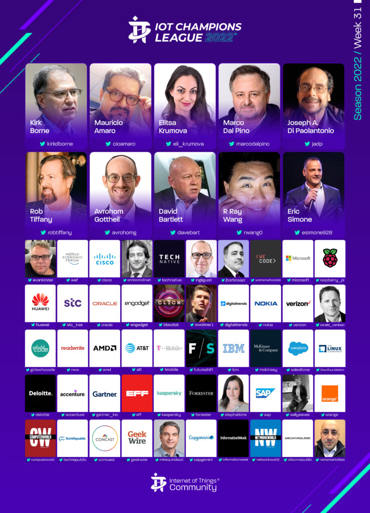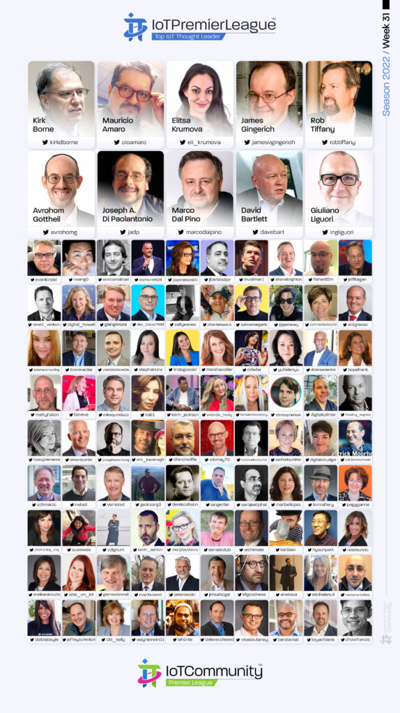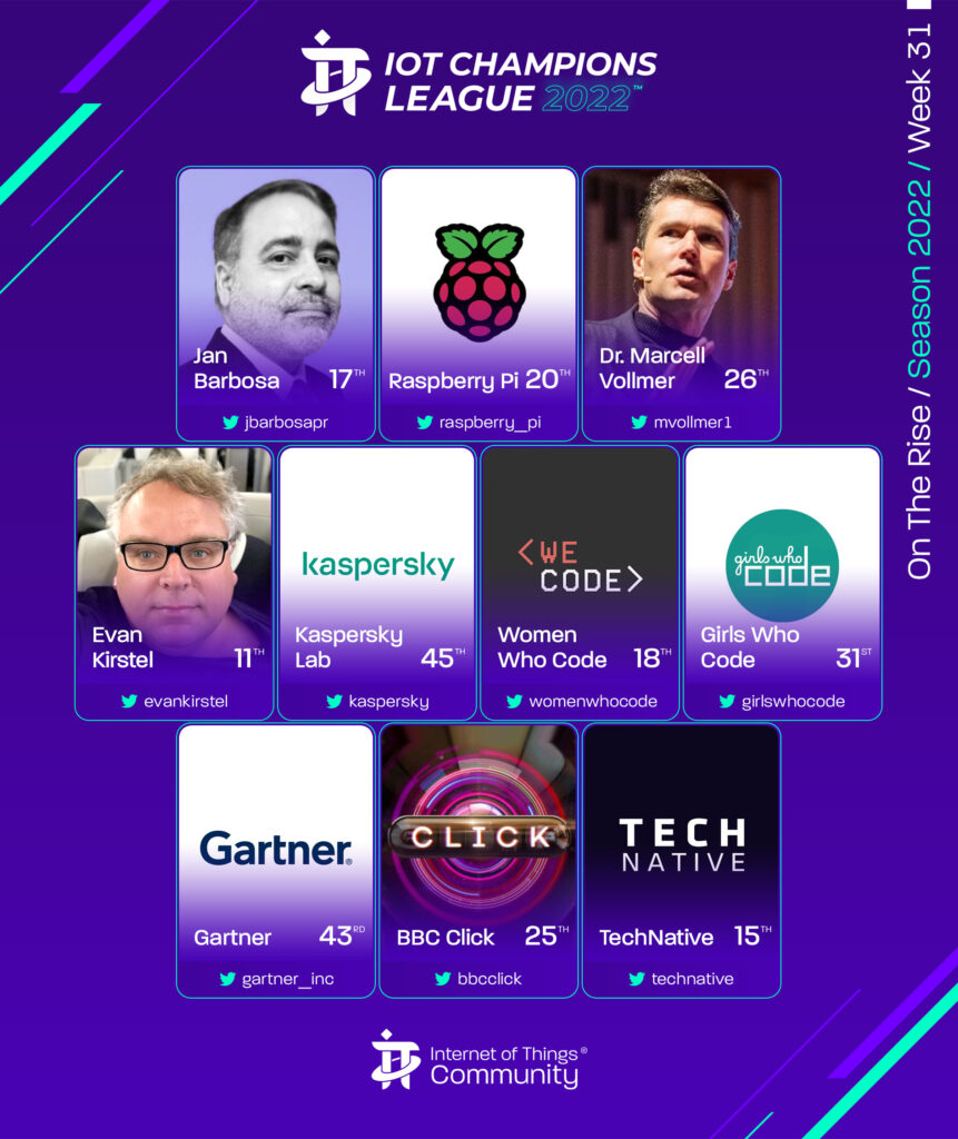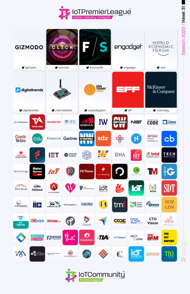 Since 2019, The IoT Premier League™ has been tracking the most inspiring social media accounts of the IoT landscape. This cuts across individual thought leaders, corporate handles and media, industry / analysts; recognising the most so you can follow them, join the community and learn more from the movers and shakers of the Internet of Things.