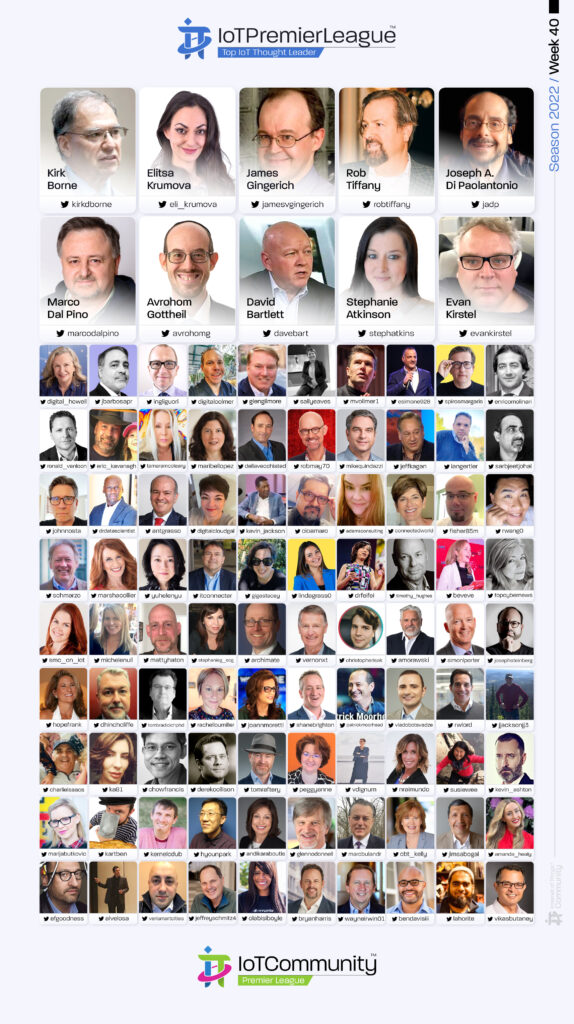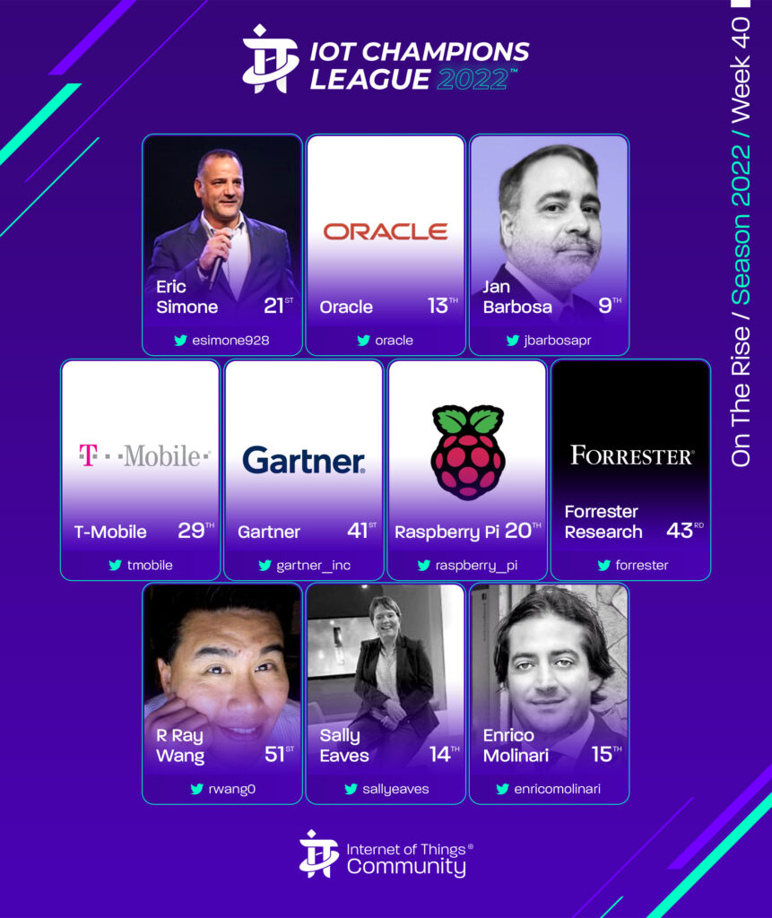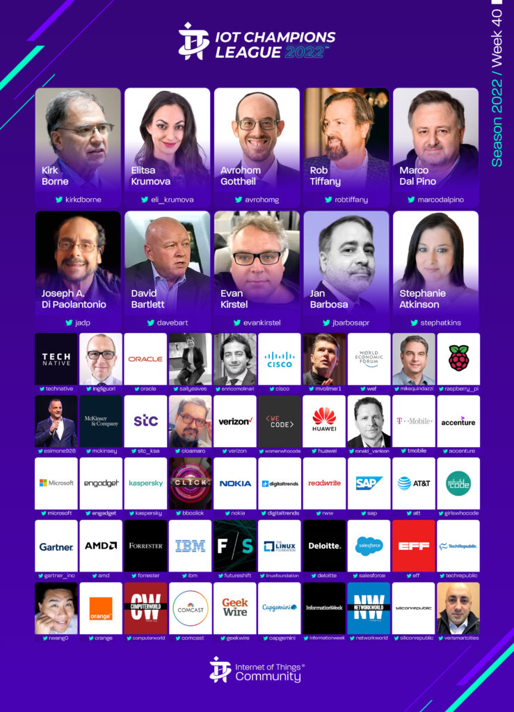 Since 2019, The IoT Premier League™ has been tracking the most inspiring social media accounts of the IoT landscape. This cuts across individual thought leaders, corporate handles and media, industry / analysts; recognising the most so you can follow them, join the community and learn more from the movers and shakers of the Internet of Things.