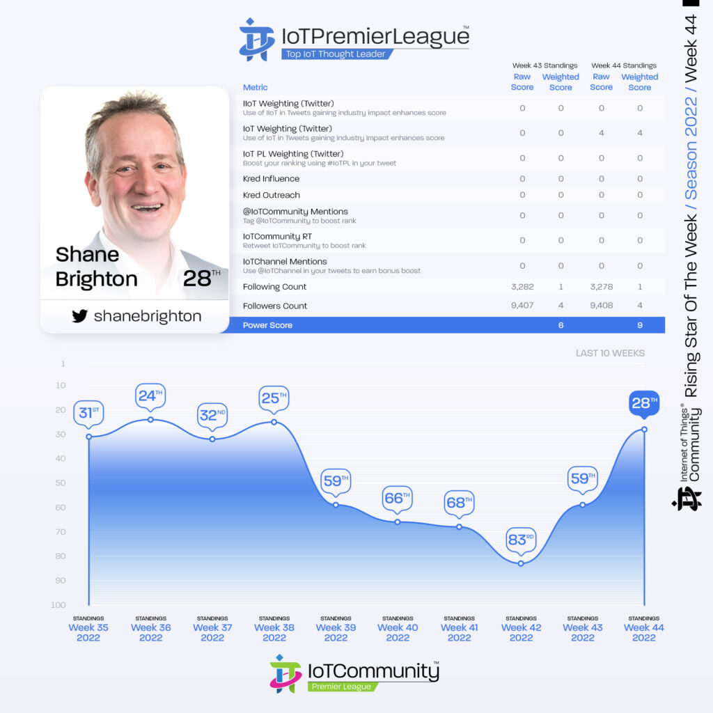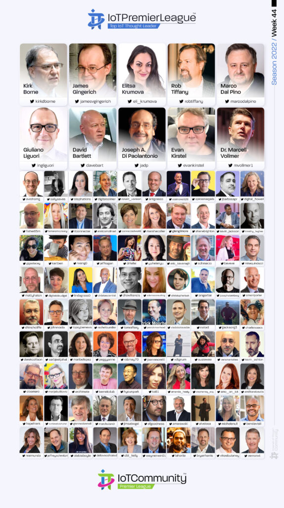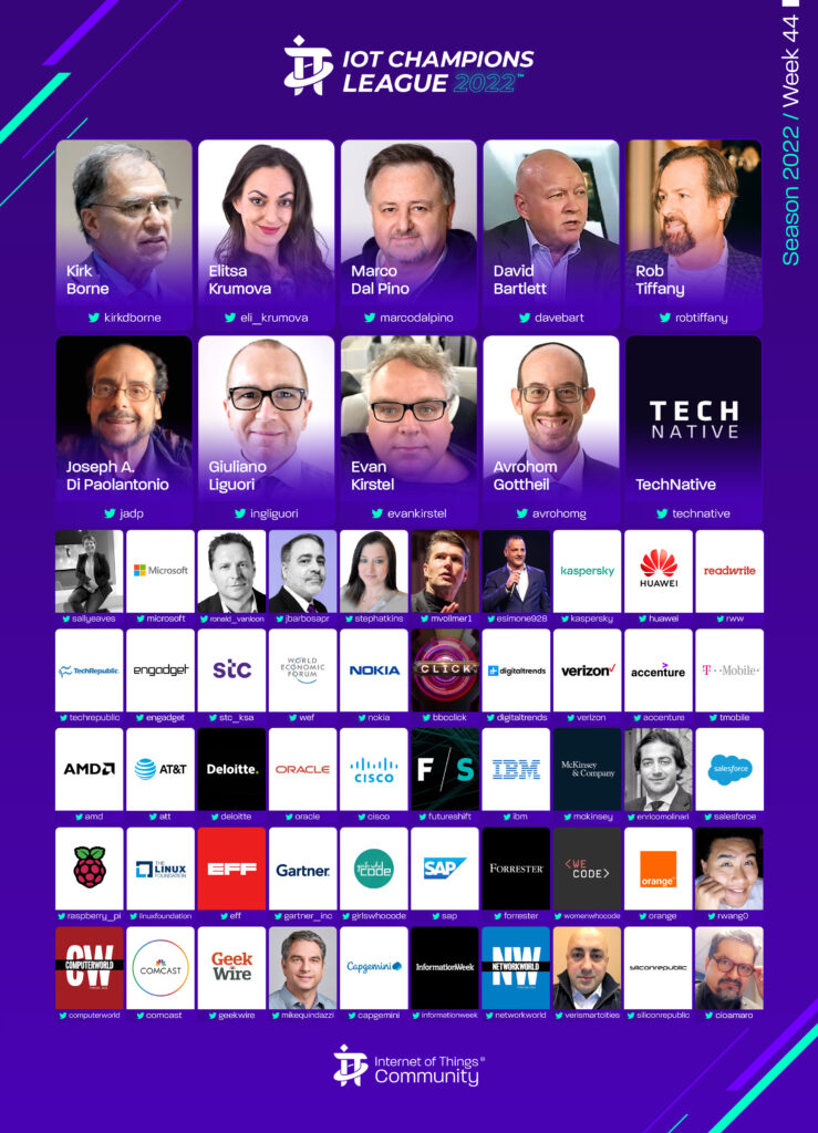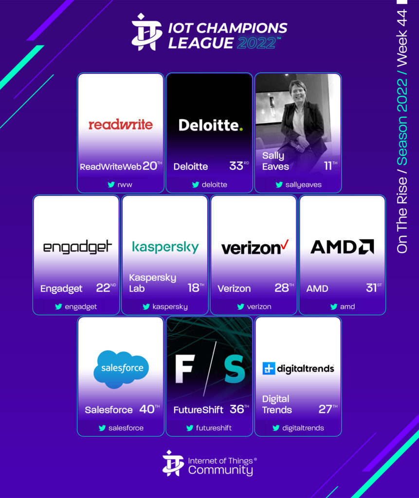 Since 2019, The IoT Premier League™ has been tracking the most inspiring social media accounts of the IoT landscape. This cuts across individual thought leaders, corporate handles and media, industry / analysts; recognising the most so you can follow them, join the community and learn more from the movers and shakers of the Internet of Things.