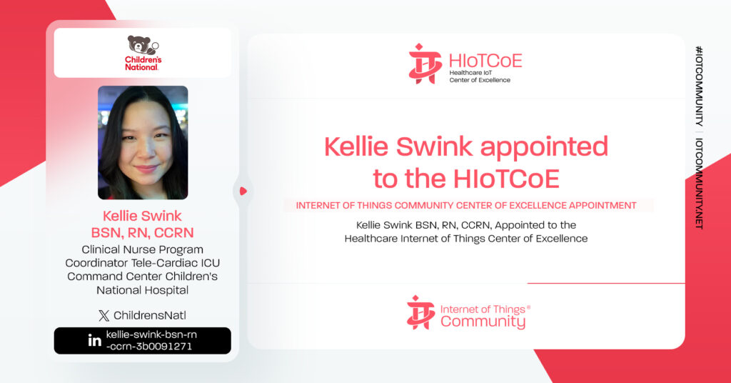 The IoT Community is thrilled to announce Kellie Swink BSN, RN, CCRN, Clinical Nurse Program Coordinator Tele-Cardiac ICU Command Center, Children’s National Hospital, joins the HIoTCoE. Kellie has been appointed as a Pillar of Excellence Leader of the Healthcare Internet of Things Center of Excellence. Please join us in congratulating Kellie on her new role within the IoT Community.