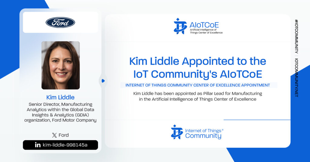 The IoT Community is excited to announce the appointment of Kim Liddle – Senior Director, Manufacturing Analytics within the Global Data Insights & Analytics (GDIA) organization at Ford Motor Company to the AIoTCoE as a Pillar Lead for Manufacturing. Please join us in welcoming Kim to the IoT Community family.