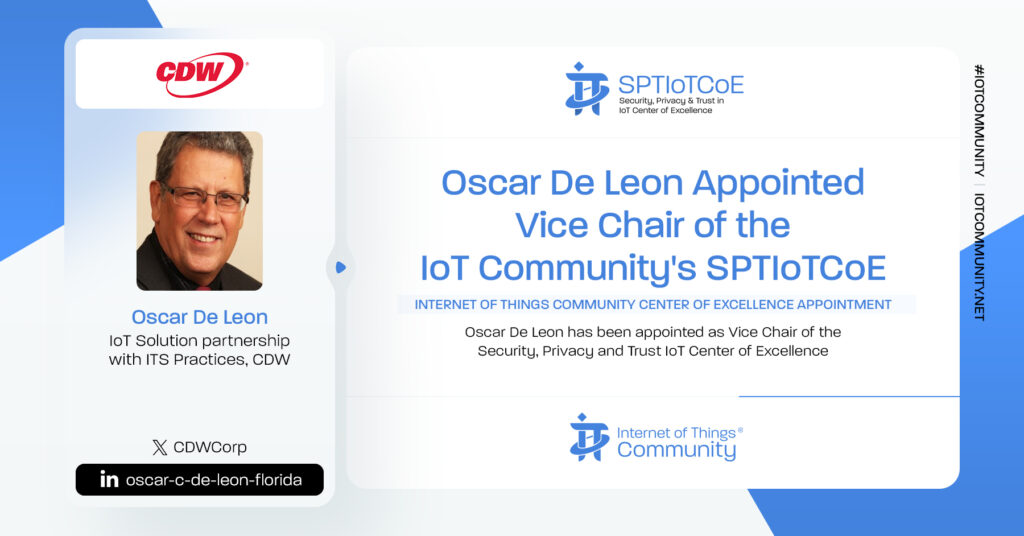 The IoT Community is delighted to announce Oscar De Leon, IoT Solution partnership with ITS Practices (Digital Velocity, Hybrid Infrastructure, Security), CDW joins the SPTIoTCoE. Oscar has been appointed as Vice Chair of the Security, Privacy & Trust Internet of Things Center of Excellence. Please join us in congratulating Oscar on his new role in the IoT Community.