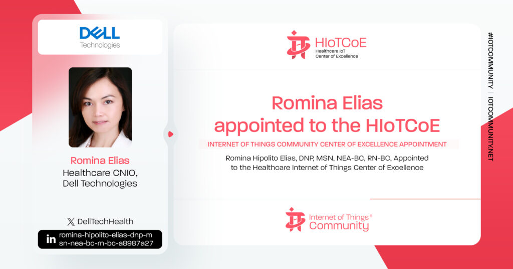 The IoT Community is thrilled to announce Romina Elias, DNP, MSN, NEA-BC, RN-BC, Healthcare CNIO, Americas, Dell Technologies, joins the HIoTCoE. Romina has been appointed as a Pillar of Excellence Leader of the Healthcare Internet of Things Center of Excellence. Please join us in congratulating Romina on her new role within the IoT Community.