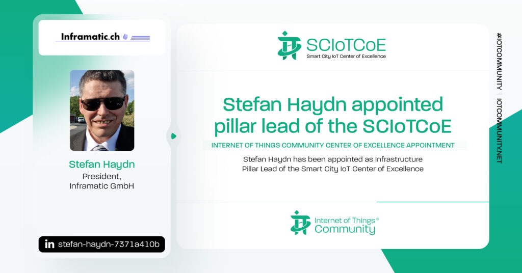 The IoT Community is thrilled to announce Stefan Haydn, Co-founder, Inframatic, joins the SCIoTCoE. Stefan has been appointed as the Infrastrcture Pillar Lead for the Smart Cities Internet of Things Center of Excellence. Please join us in congratulating Stefan on his new role in the IoT Community.